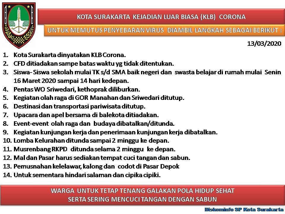 Walikota Kota Surakarta Tetapkan Status KLB ( Kejadian Luar Biasa ) Virus Korona